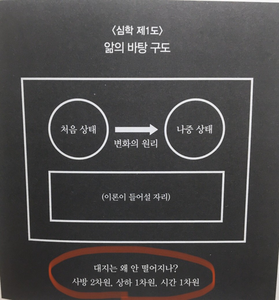 ② 마찬가지로 위 '앎의 바탕 구도' 사진에 있는 "대지는 왜 안 떨어지나?", '사방 2차원, 상하 1차원, 시간 1차원' 등과 같은 차원 개념이 어떻게 진화해나갈 것인지 주의해가며 읽어가도 좋을 것이다.