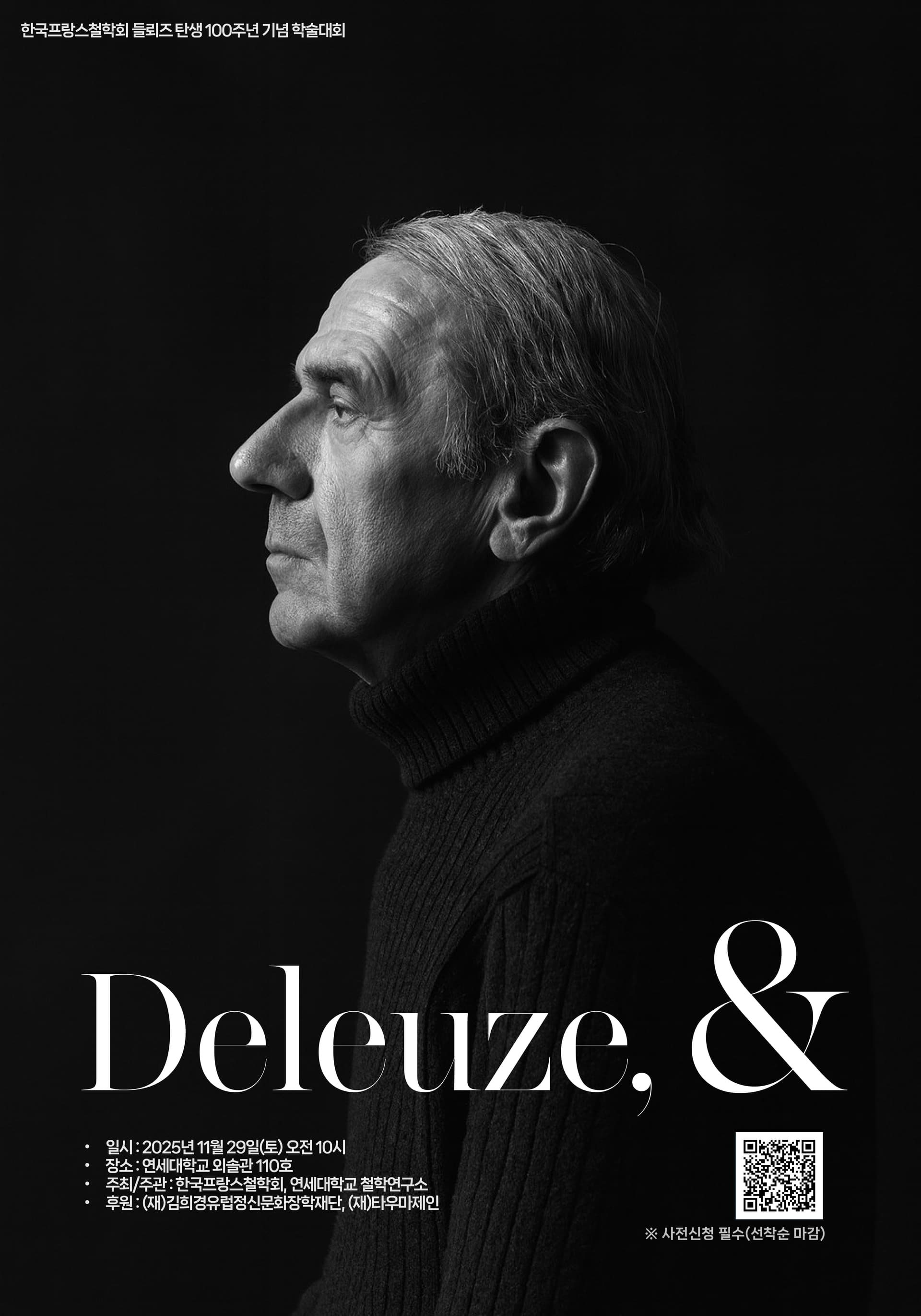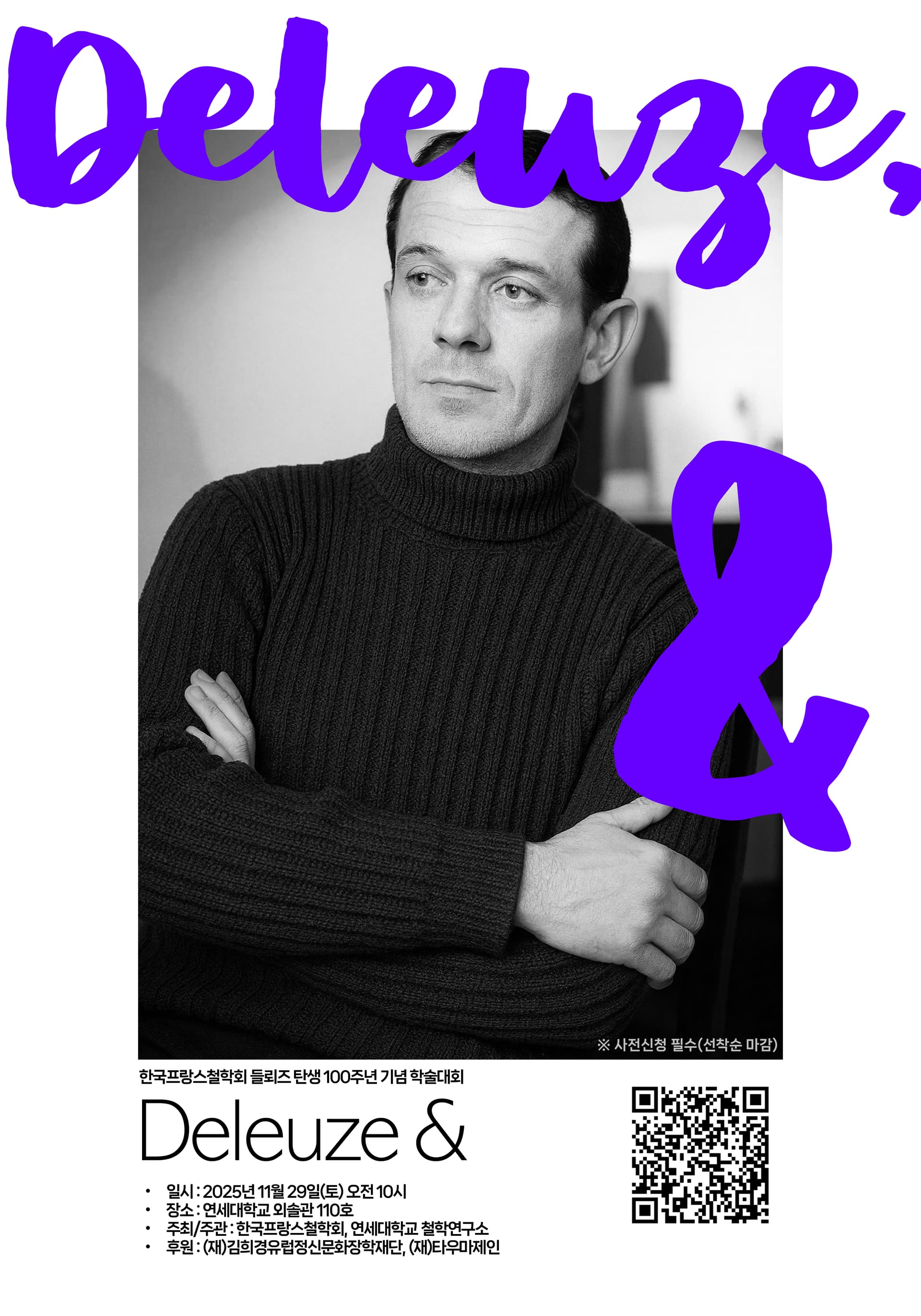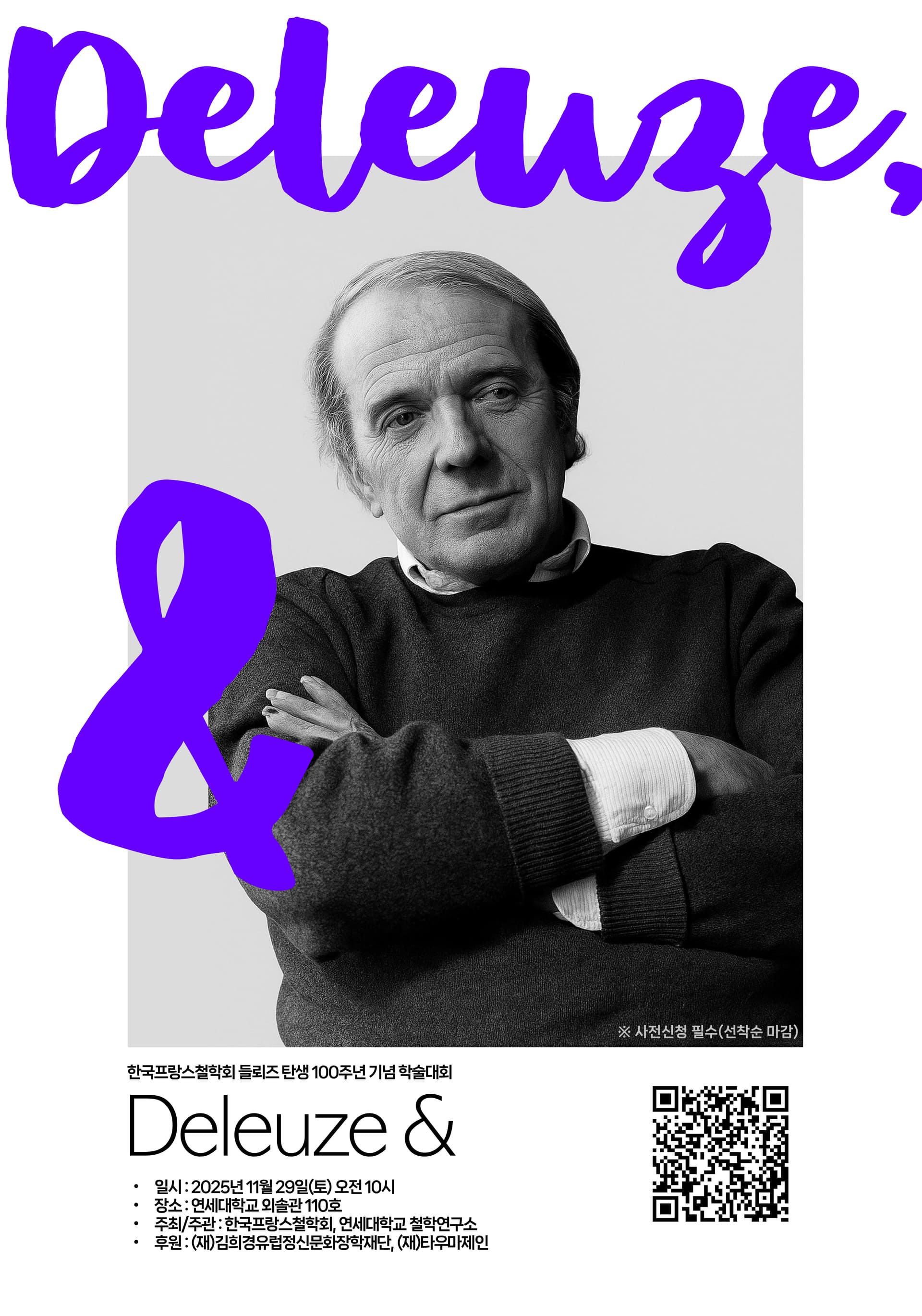 올해는 프랑스 철학자 질 들뢰즈의 탄생 100주년을 맞이하는 뜻깊은 해입니다.프랑스를 비롯한 세계 여러 나라에서 들뢰즈의 사유를 기념하는 학술대회와 다양한 문화 행사가 열리고 있는 가운데, 한국프랑스철학회도 이에 발맞추어 11월 29일 연세대학교 외솔관에서 학술대회를 개최하게 되었습니다.