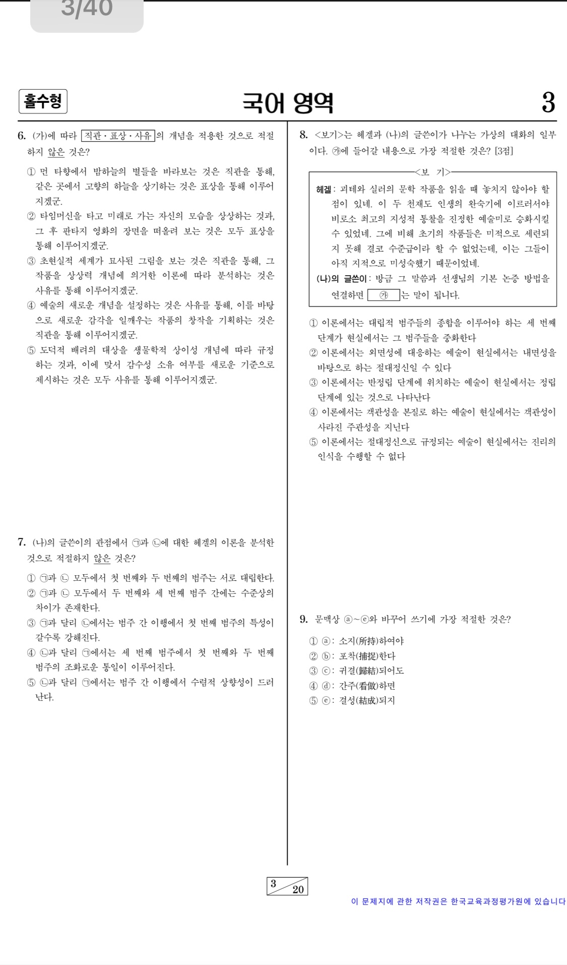 처음에 읽을땐 정신현상학 입문서에 들어갈만한 수준이라고 생각했다. 하지만 내가 대학원에서 철학을, 특히나 대륙철학을 공부하지 않았으면 술술 쉽게 읽어냈을까? 싶다. 답을 맞추긴 쉬우나, 내가 이 지문을 처음 읽는 수능생이라면 난해할것같고 무슨 헛소리를 하는지 이해하지 못할것같다. ‘종합’, ‘절대정신’, ‘직관.표상.사유’’ ‘범주’ 등이 특히 그럴것 같다. 만약 이 문제가 ‘오답률과 관계없이’ 수험생들에게 잘 읽히는 지문이었다면, 한국 수험생의 지성이 정말 굉장히 뛰어난것은 사실이 아닐까…
