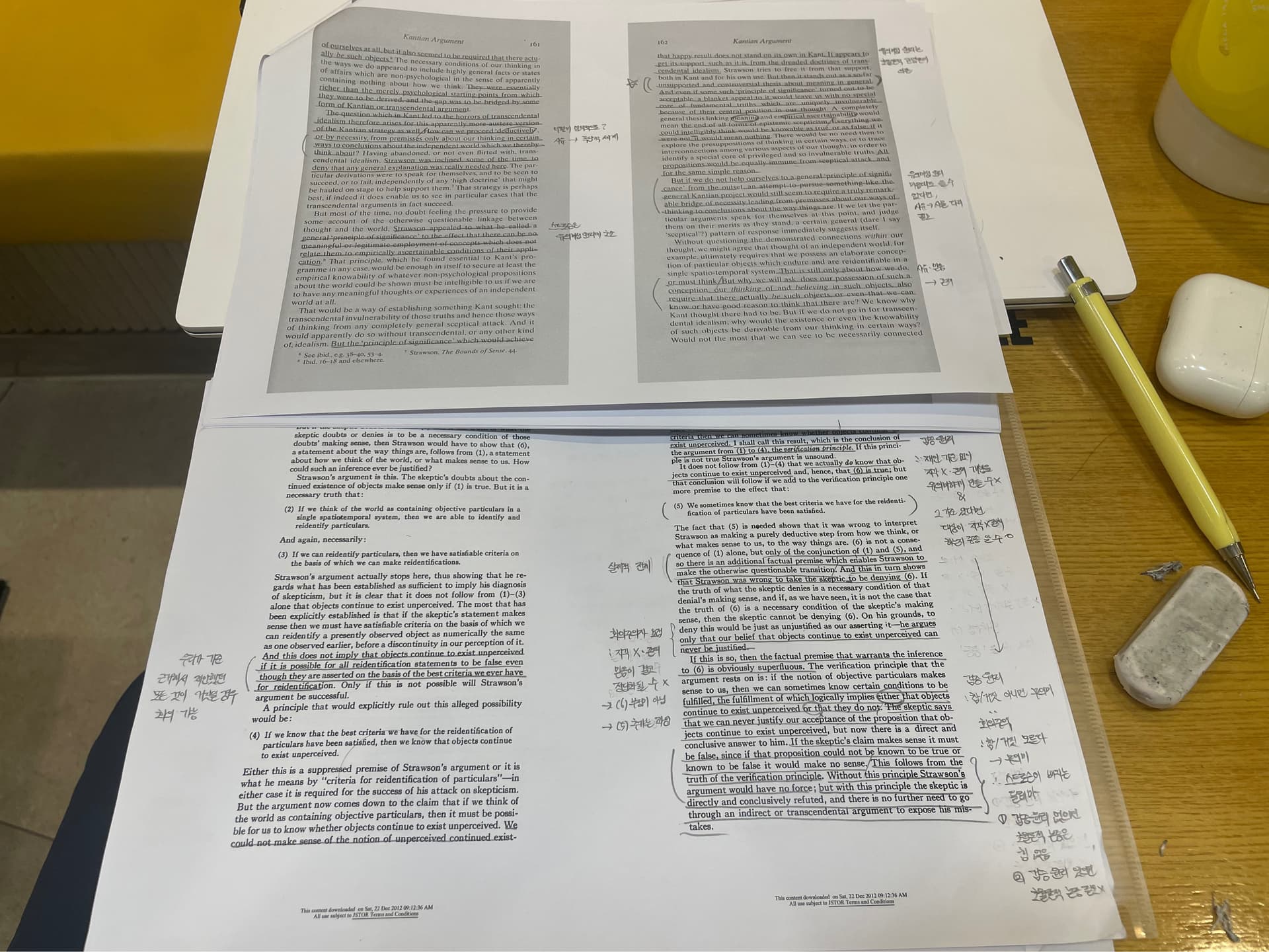스트라우드가 1968년에 쓴 유명한 논문인 "Transcendental Arguments"를 읽고서 1994년에 쓴 " Kantian Argument, Conceptual Capacities, and Invulnerability"를 읽는데, 세상에, 거의 똑같은 주장을 하는 논문인데도 후자가 전자보다 훨씬 명료하게 쓰여 있네요.