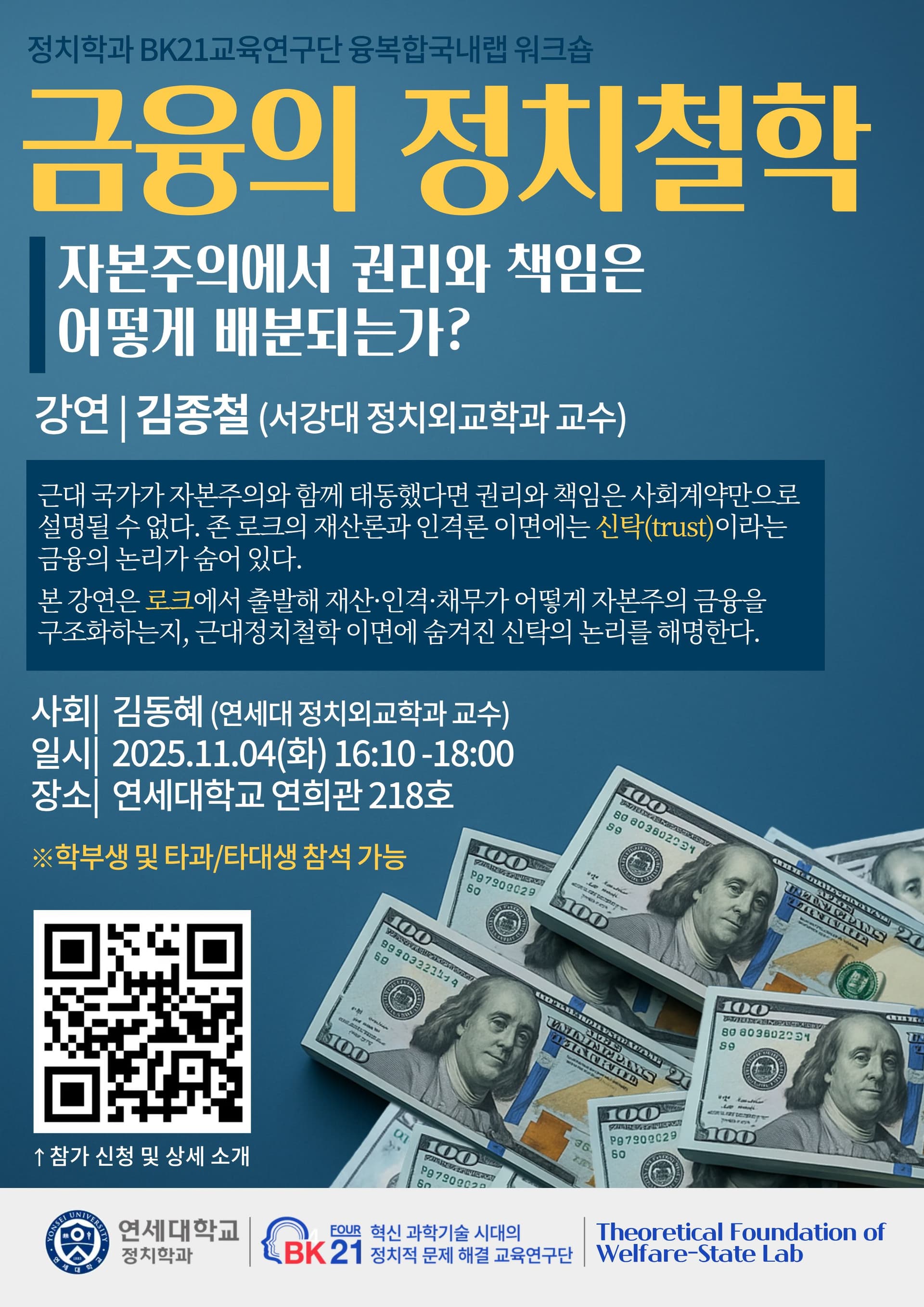 서강대 정치외교학과 김종철 교수님께서 최근 저서 Modern Money and the Rise and Fall of Capitalist Finance: The Institutionalization of Trusts, Personae and Indebtedness (2023), 논문 "Property and Trusts: a Modern Project to Create Individual and Collective Personae" (2024) 내용을 중심으로 연세대학교에서 특강을 하시는데요. 소속 상관없이 참석 가능하니 관심 있으신 분들의 많은 참석 부탁드립니다 ![]()