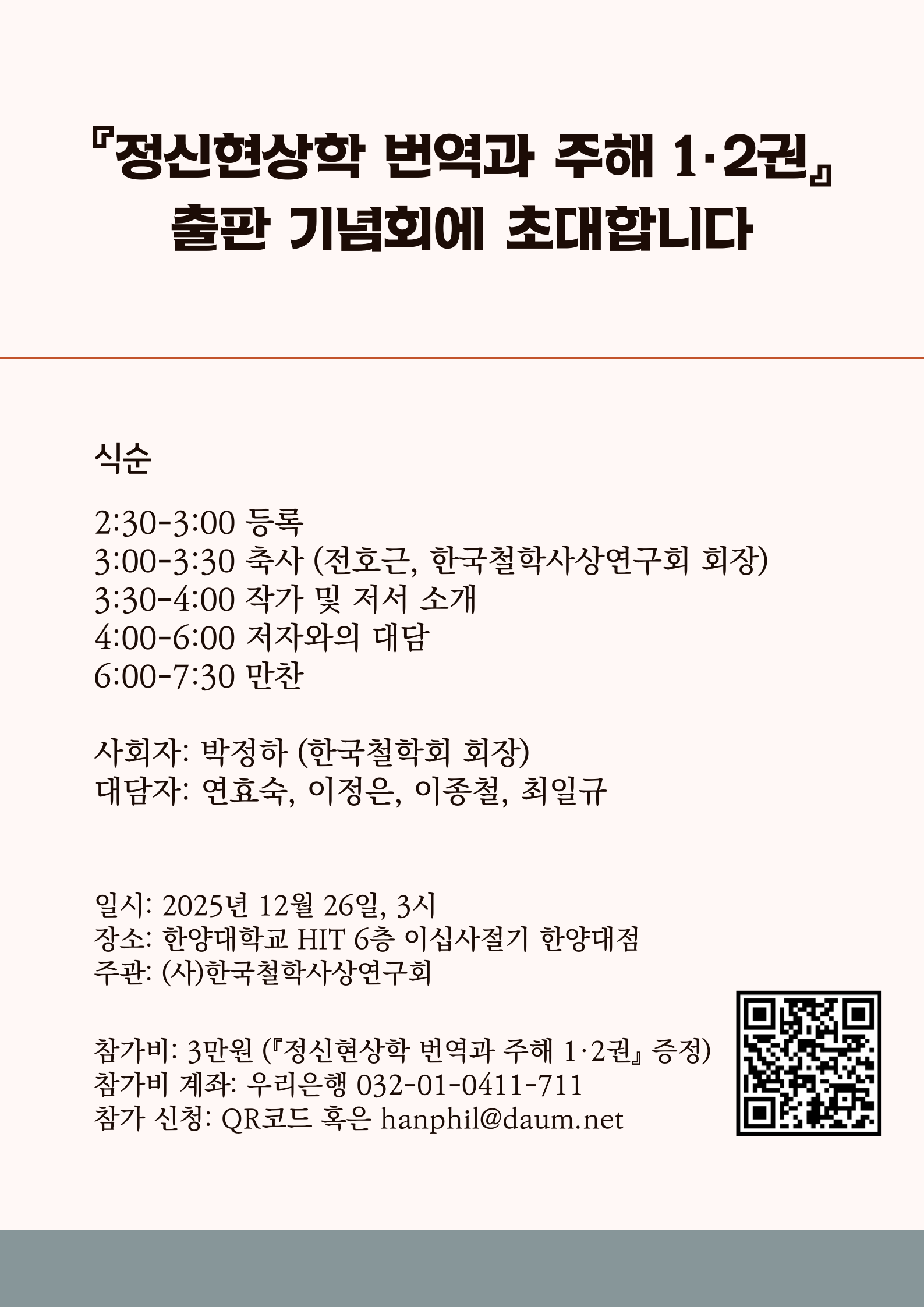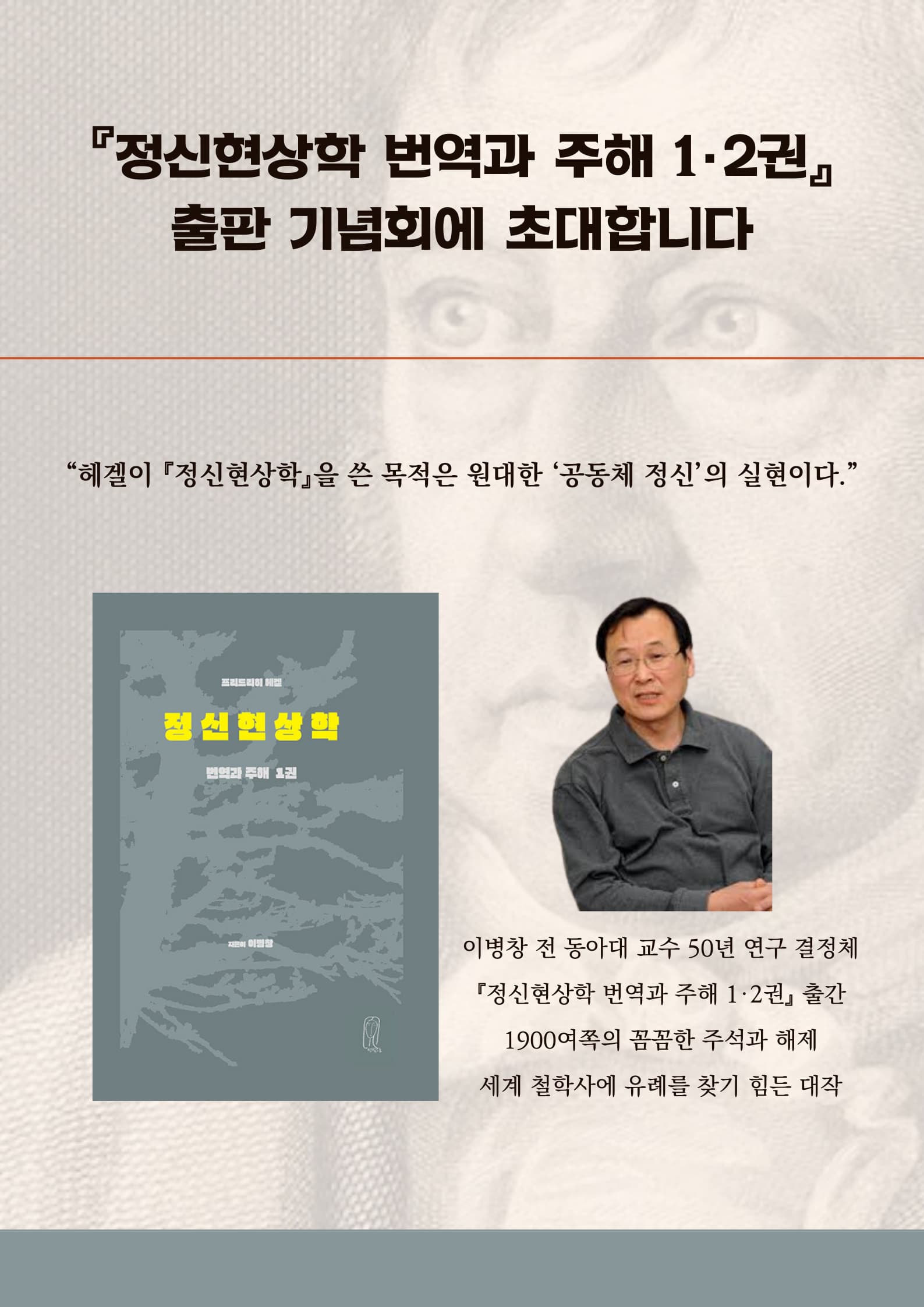 이병창 선생님의 『정신현상학 번역과 주해』 출판 기념회에 다녀 왔습니다. 참여한 대학원생들에게 책을 무료로 나눠주셔서 저도 선물을 받아 왔네요. 이병창 선생님께서 대담을 통해 여러 가지 말씀들을 하셨지만, (1) 『정신현상학』이 말하는 '정신'은 '신' 같은 초자연적인 대상이라기보다는 '공동체'라고 강조하신 점, (2) 이번 책에서는 서론에 등장하는 '의식의 경험'이라는 키워드를 바탕으로 『정신현상학』 전체를 일관적으로 독해하고자 노력하셨다는 점, (3) 『정신현상학』의 핵심 사상은 "하나이자 전체(hen kai pan)"라는 표어로 요약될 수 있다고 하신 점이 기억에 남네요. 아직 책을 자세히 읽어보지는 못하였지만, 이병창 선생님께서 제시하신 해석의 기본 방향에 많은 동의가 되어서 앞으로 이 책을 자주 참고하게 될 것 같습니다.
