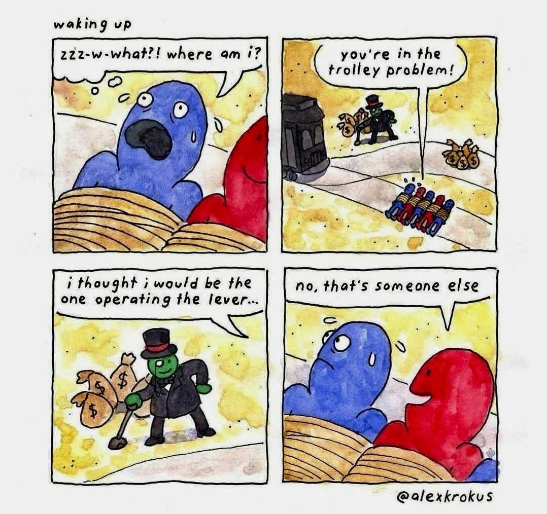 우리가 트롤리 딜레마를 고민할 필요가 없는 이유. 자본주의 사회에서 우리 대부분은 레버를 작동시키는 위치에 있지 않기 때문입니다….…. 결정권은 자본가들에게 있는 거죠?!?!