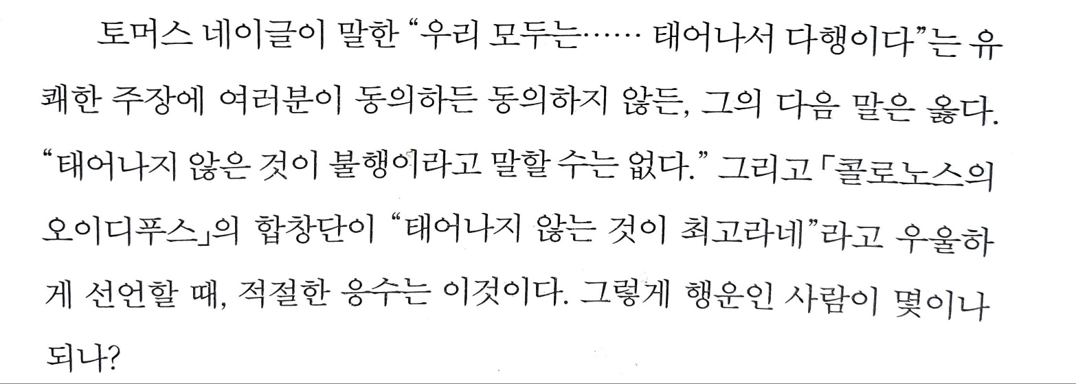 이런 식의 응수가 반출생주의를 얼마나 강하게 반박하는지는 모르겠으나 위트(?)는 있어보이는 반박 같네요. 가끔 제 친구도 애초에 태어나지 않았으면 더 좋았을거라며 농담조로 말하던데, 다음에 한 번 "그렇게 행운인 사람 몇이나되나?" 저 말을 써먹어볼까 합니다ㅎㅎ