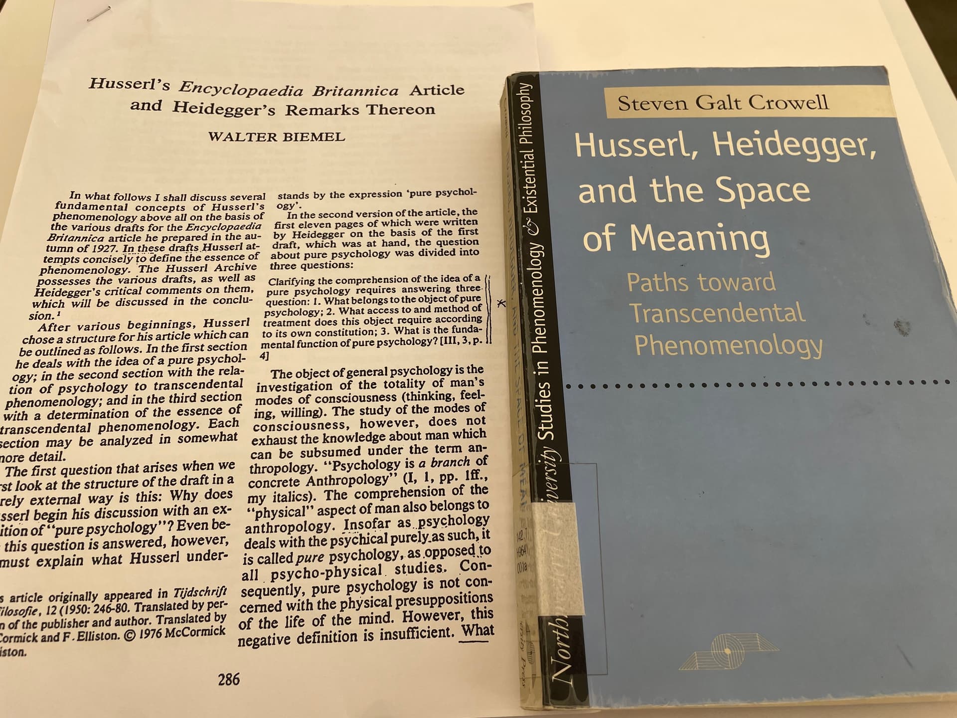 개인적으로, 크로웰의 글은 읽으면 읽을 수록 매우 탁월하다는 생각이 듭니다. 저는 크로웰의 책 Husserl, Heidegger, and the Space of Meaning을 그동안 필요한 챕터만 뽑아내어 파편적으로 살펴보았는데, 요 몇 달동안 저 책의 내용을 다시 전체적으로 보니 정말 분석의 폭과 깊이는 물론이고, 독창성까지도 아주 훌륭하네요. 사실, 저는 비멜이 자신의 논문에서 후설과 하이데거의 차이로 분석해 놓은 내용을 보면서 아주 의아한 부분이 많았습니다. 비멜의 글이 이 분야 연구자들에게는 거의 고전이 되었지만, (적어도 제가 보기에) 실제 내용을 읽어보면 너무나 허술한 지점들이 있었거든요. 가령, 하이데거가 이미 『브리태니커 백과사전』 현상학 소개문 제2판을 작성하면서 스스로 '환원'이라는 표현을 사용하고 있을 뿐더러, 『현상학의 근본문제들』이라는 강의록에서도 '환원'을 도입하고 있는데, 비멜은 별다른 근거 없이 "하이데거에게는 환원이 완전히 빠져 있다."라는 강한 논제를 내세우니 저로서는 받아들이기가 무척 어려웠습니다. 또 비멜 자신이 애초에 『브리태니커 백과사전』 현상학 소개문을 충분히 이해하지 못한 티가 나는 부분도 있는데, 이 소개문 마지막에 후설이 현상학을 '보편적 존재론'으로 강조하고 있는 것에 반해, 비멜은 왜 현상학이 보편적 존재론인지 잘 모르겠다고 스스로 고백하고 있기도 하죠. (그리고 이 부분에서 비멜은 결정적으로 후설의 '현상학'과 하이데거의 '존재론' 사이의 공통점을 놓치고 있기도 하다고 저는 생각합니다.) 그리고 이런 기존 연구의 허술함에 비추어 볼 때, 크로웰이 완전히 다른 관점에서 『브리태니커 백과사전』 현상학 소개문으로부터 후설과 하이데거의 연속성을 이끌어내는 것은 참 시원하더라고요.