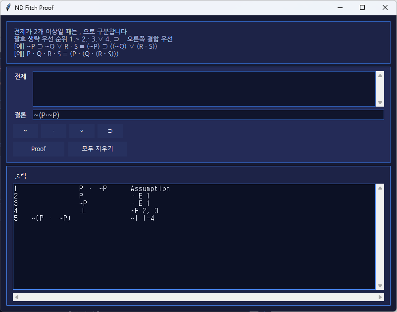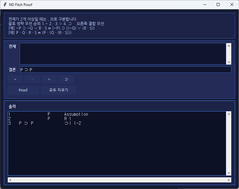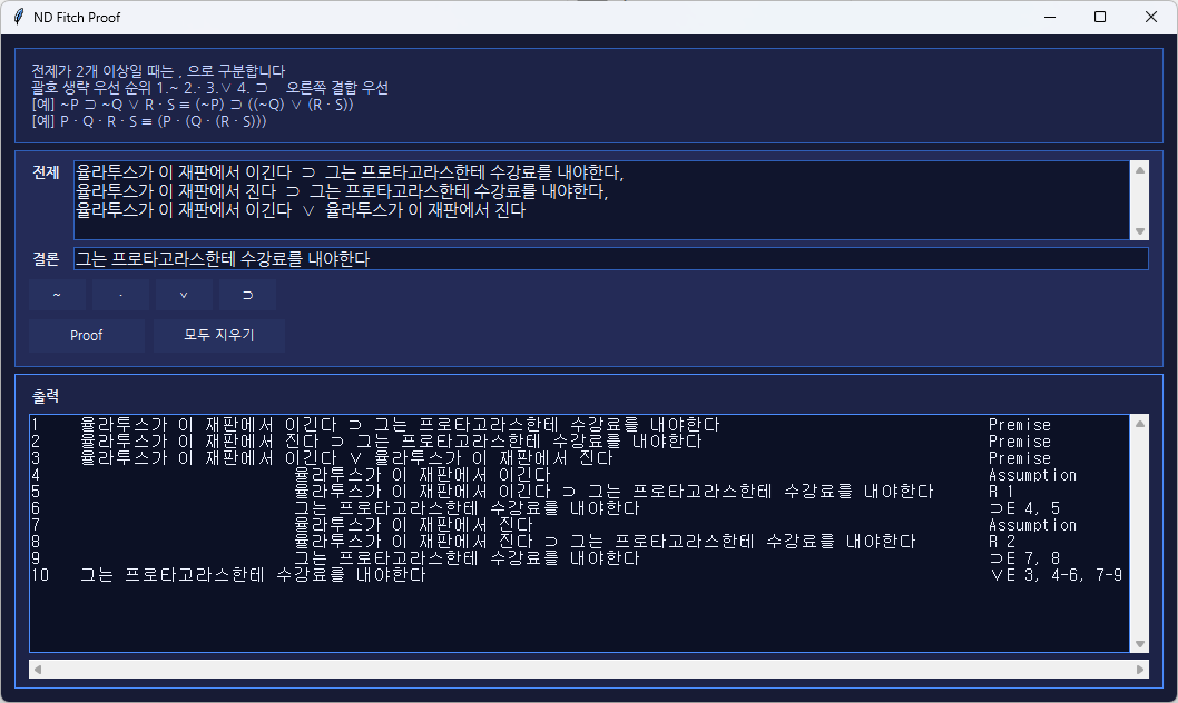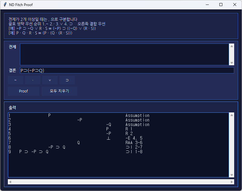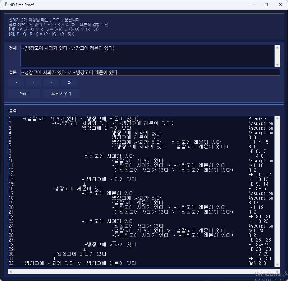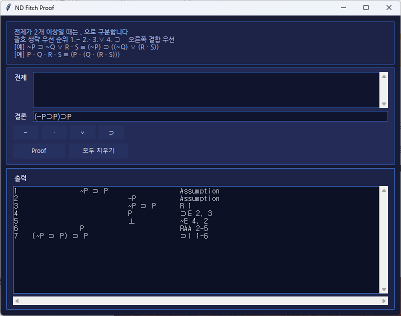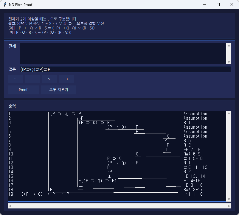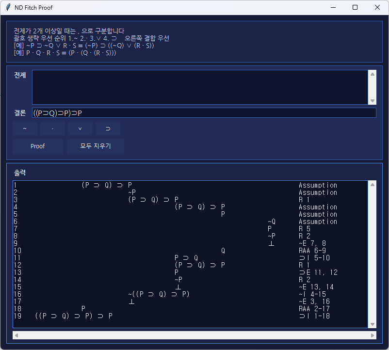 Fitch나 Lemmon 같은 선형 증명 방식이 아무래도 컴퓨터로 구현하기 쉽기 때문에 Fitch 방식을 채택하여 만들었습니다. 다음은 퍼스의 법칙 증명인데