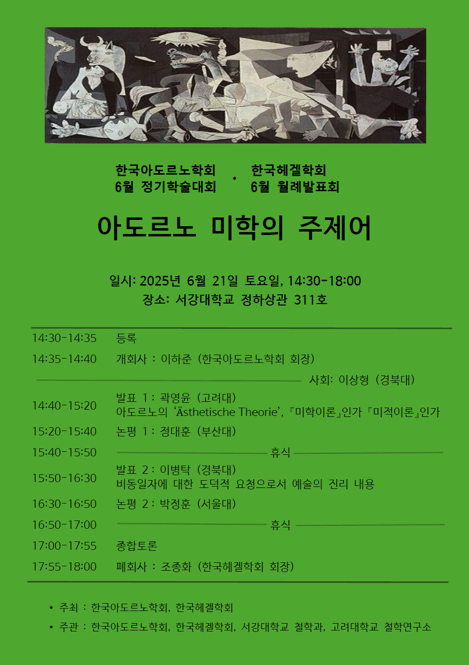 한국아도르노학회와 한국헤겔학회의 공동 학술대회가 서강대학교에서 열린다고 하네요.
